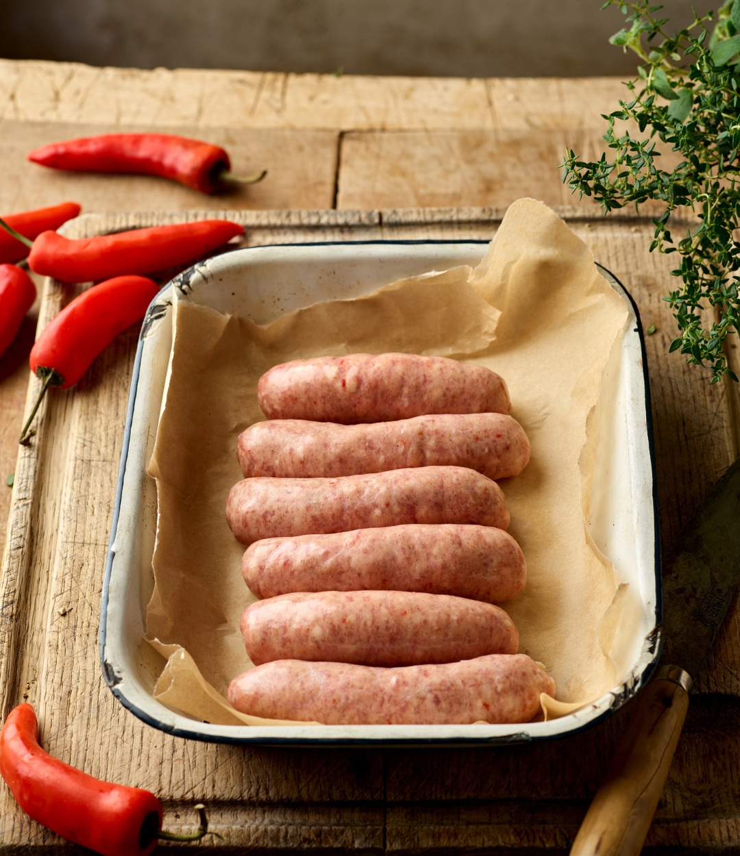 Our pork and chilli sausages are made with the highest quality, free-range, pasture-raised pork and carefully balanced chilli for the perfect mix of spicy and savoury. Made with locally grown chillies sourced in Devon, these bangers pop with a warmth that will make your taste buds dance. Perfect for those who enjoy a little heat in their meals.